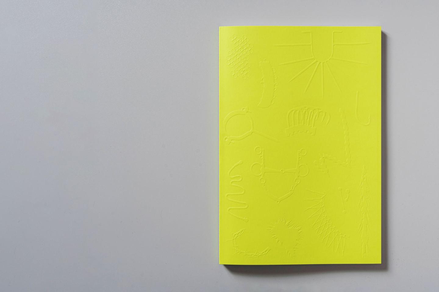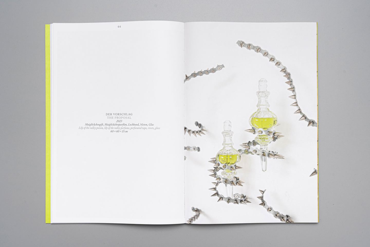 Transferring this attraction into a book object, we embossed individual elements of her work onto the cover. The familiar and recognizable forms, upon closer inspection, trigger an awkward, almost unsettling feeling. When you open the catalog, the negative of the shapes serves as part of the table of contents and becomes a narrative and functional element at the same time. Another key component of our design is the concentrated color of the poisenous lily of the valley. Green yet yellowish, it refers to the ambiguous character of Simone Karl’s work and creates a link to the eponymous title Mercury Garden.