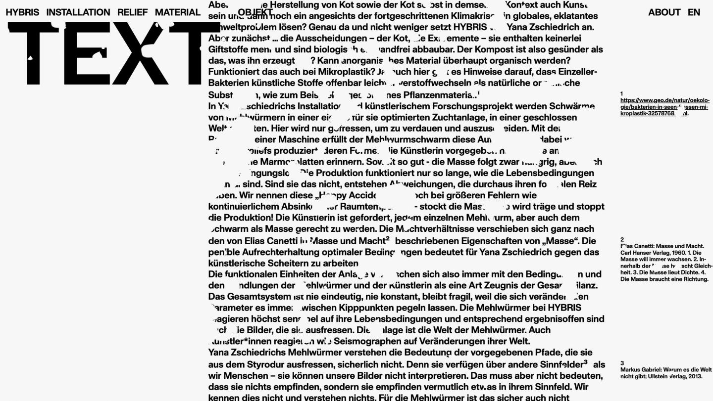 To unify the individual parts of Yana's work, we've designed a large-scale canvas that serves as both an exhibition space and an archive. The dynamic navigation allows users to seamlessly explore the entire body of work, connecting individual pieces and ensuring each receives equal emphasis. Above all the eroding typography is directed by the sculptural act of mealworms that shape and decompose polystyrene insulation panels, giving this core method presence and creating identity.