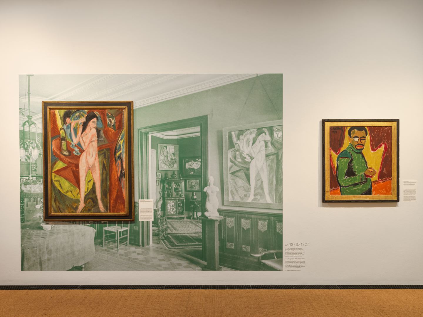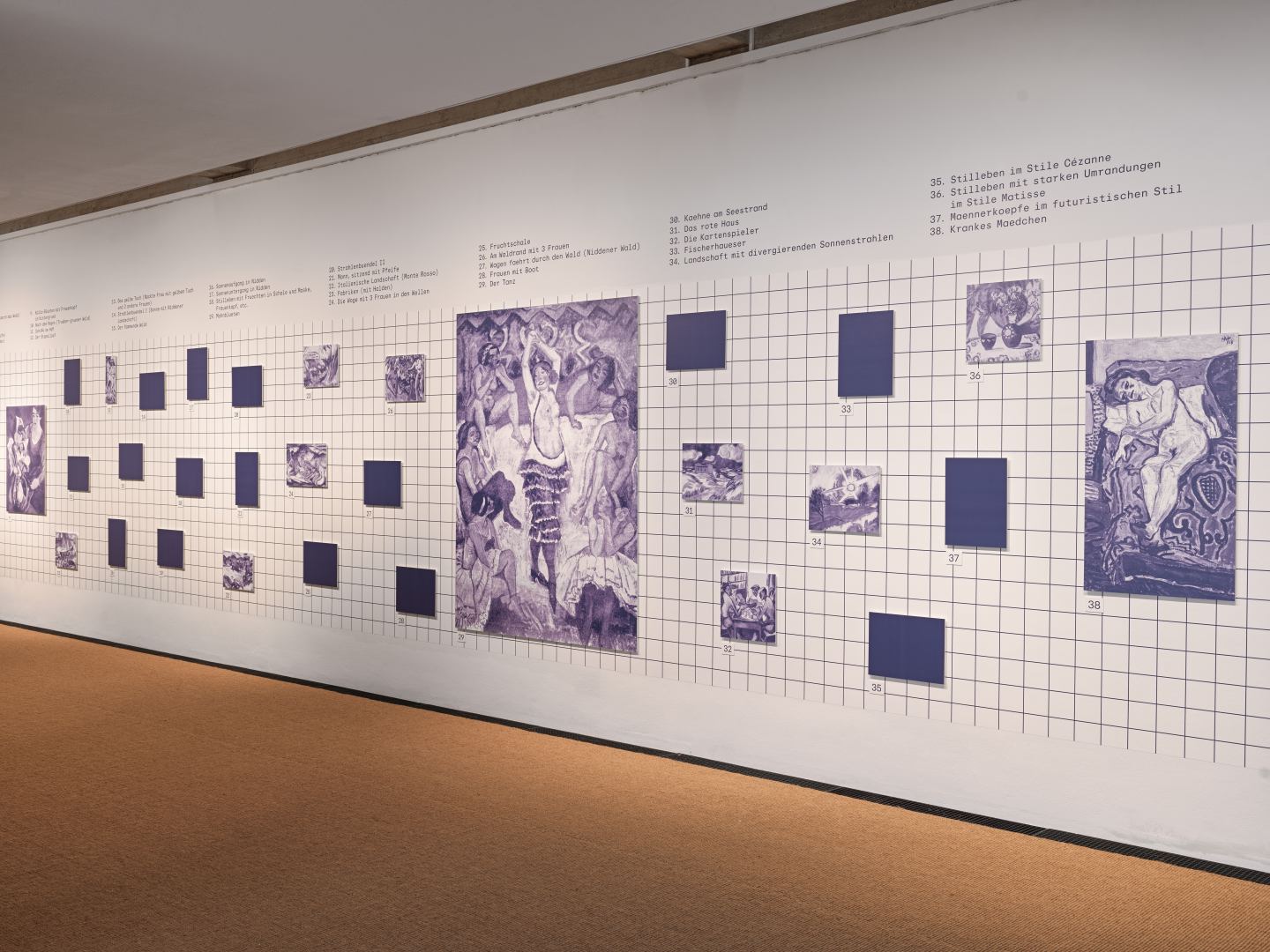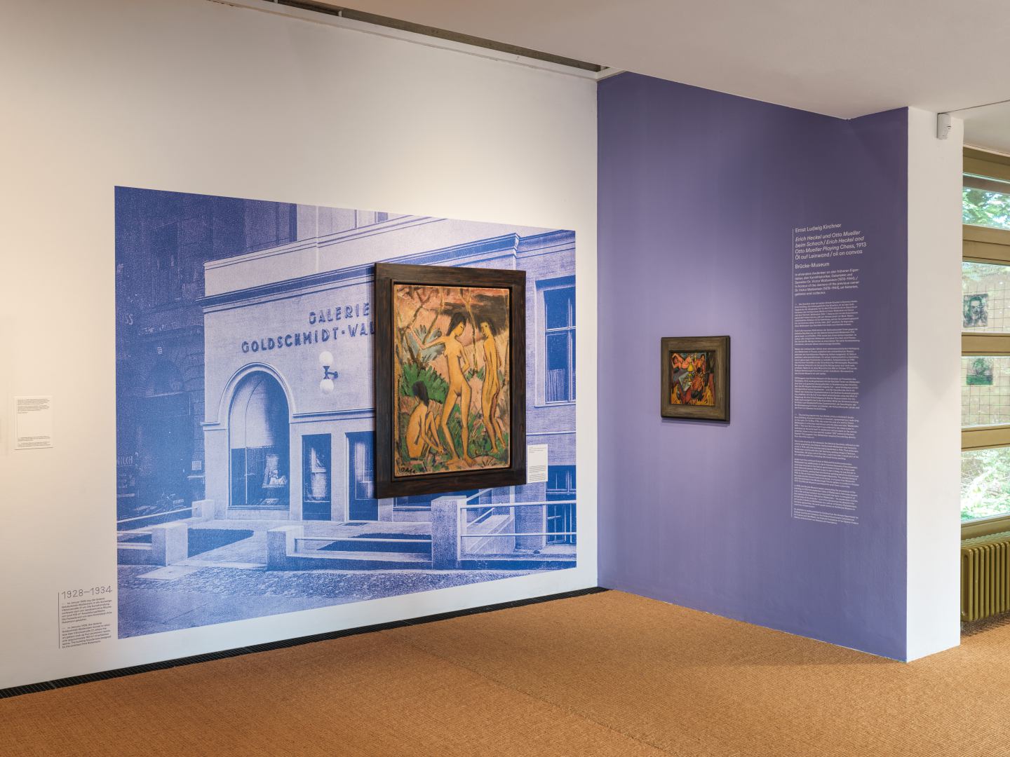 The exhibition design revolves around the biographies of the collectors, presenting seven individual timelines that highlight pivotal moments in their lives. Large-scale images invite visitors to immerse themselves in the era and personal stories of each collector. The vibrant, multi-colored design reflects their unique personalities and visionary perspectives, which have left a lasting imprint on art history. The scenography and design weave together the three narrative levels—the collectors' biographies, the Brücke artists' works from their private collections, and the history of provenance research as illustrated through selected artworks.
