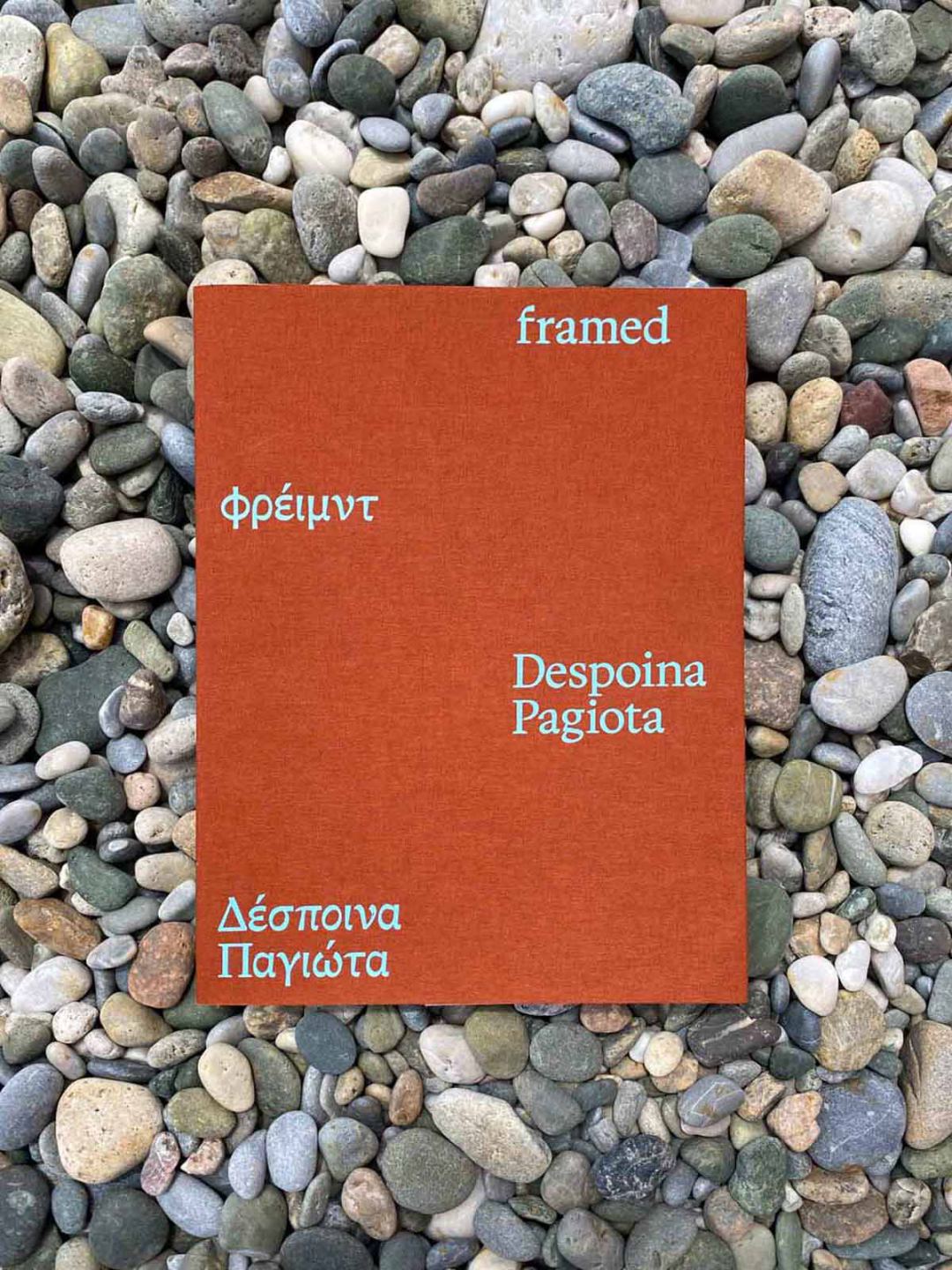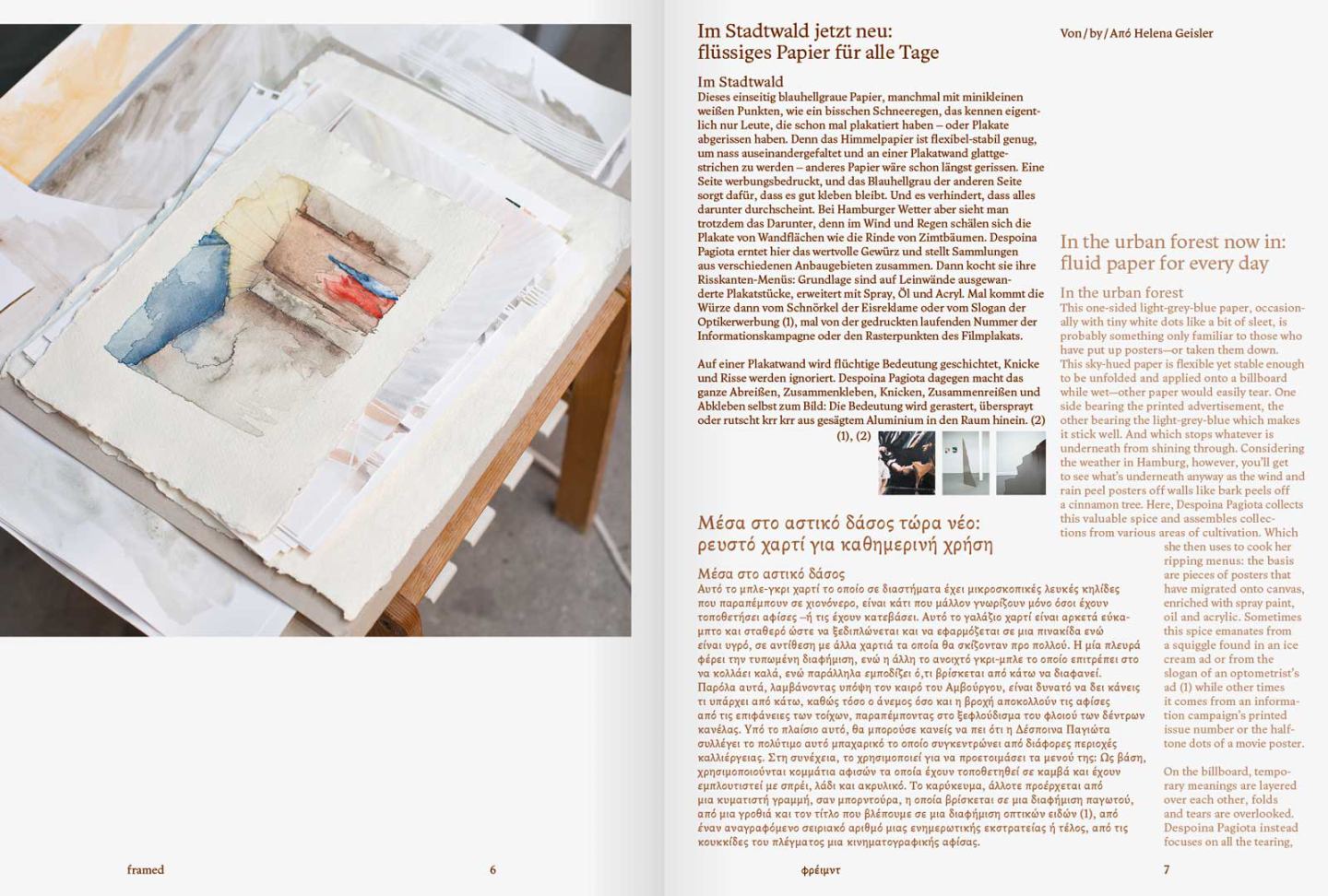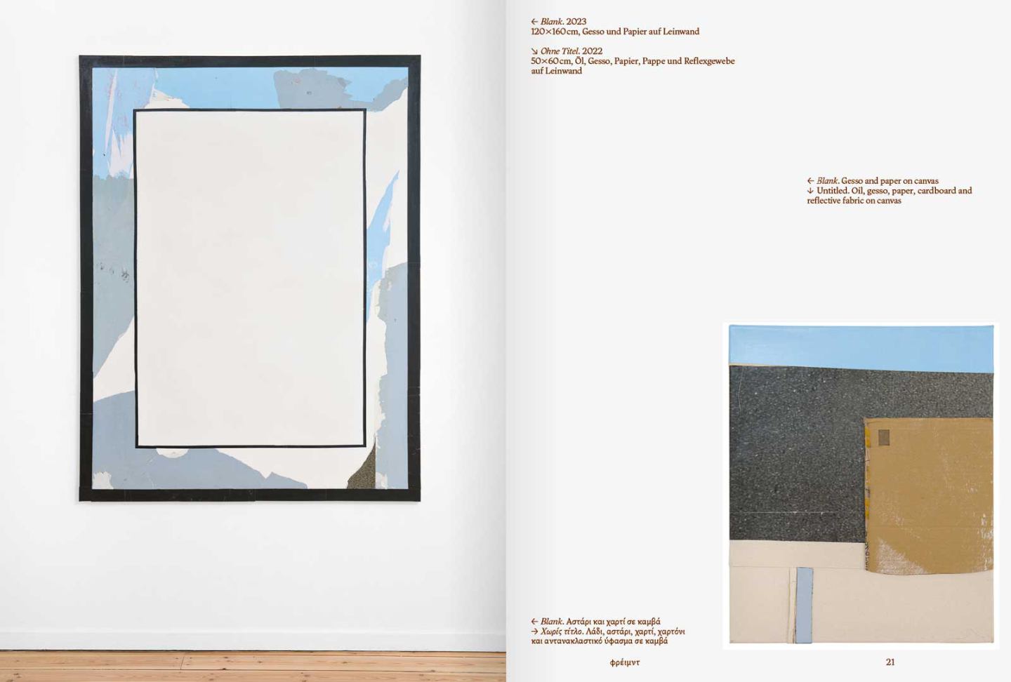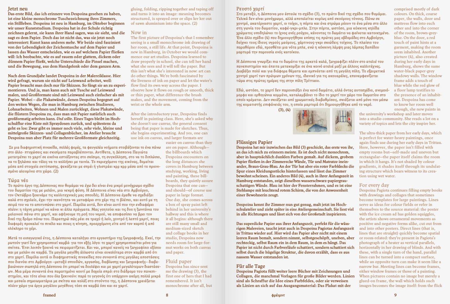 The source material for Despoina Pagiota’s paintings consists of decollaged posters. When applied to canvas, the fragments, marked by their distinctive tears, serial numbers, print grids, and decontextualized bits of advertising, are reimagined by the artist. Recently, she has been experimenting with the materiality of posters, shaping them into frame forms created by objects that serve as three-dimensional extensions of her previous bodies of work. In parallel, she creates artist books, which Pagiota often uses to explore compositional possibilities through drawing. The publication titled “Framed” was created as part of the 2022/2023 scholarship at the Trittauer Wassermühle. As the artist has her roots in Greece, the catalog is multilingual, featuring English, Greek, and German. Drawing inspiration from the artist’s affection for grids and strong compositions, we have developed a typographical concept that is playful yet clean and geometrical.