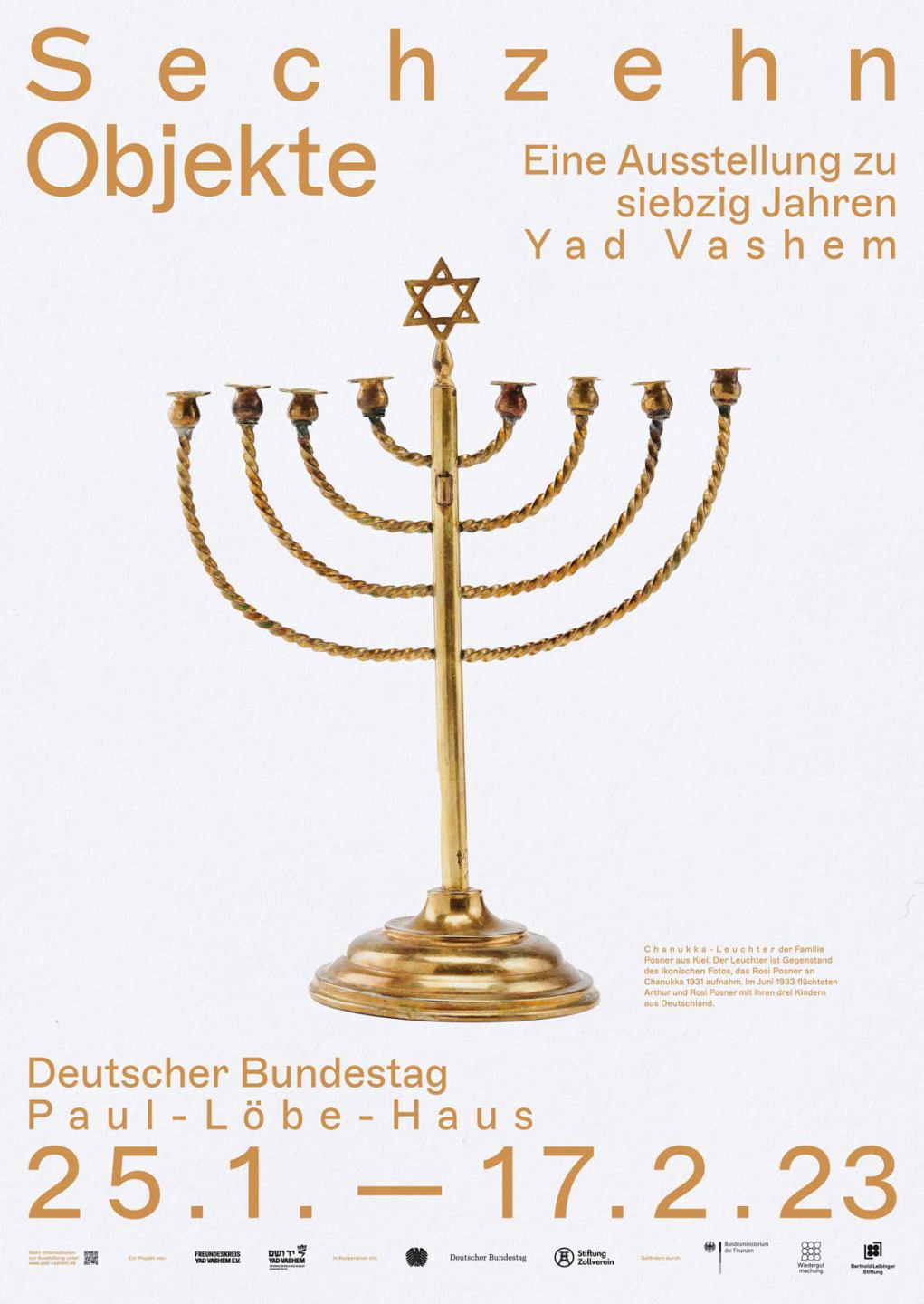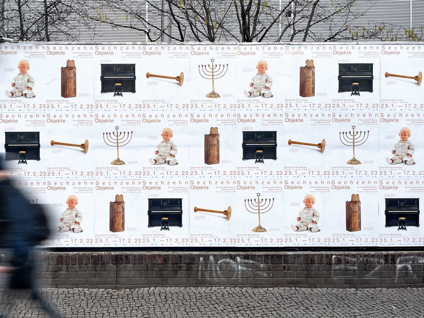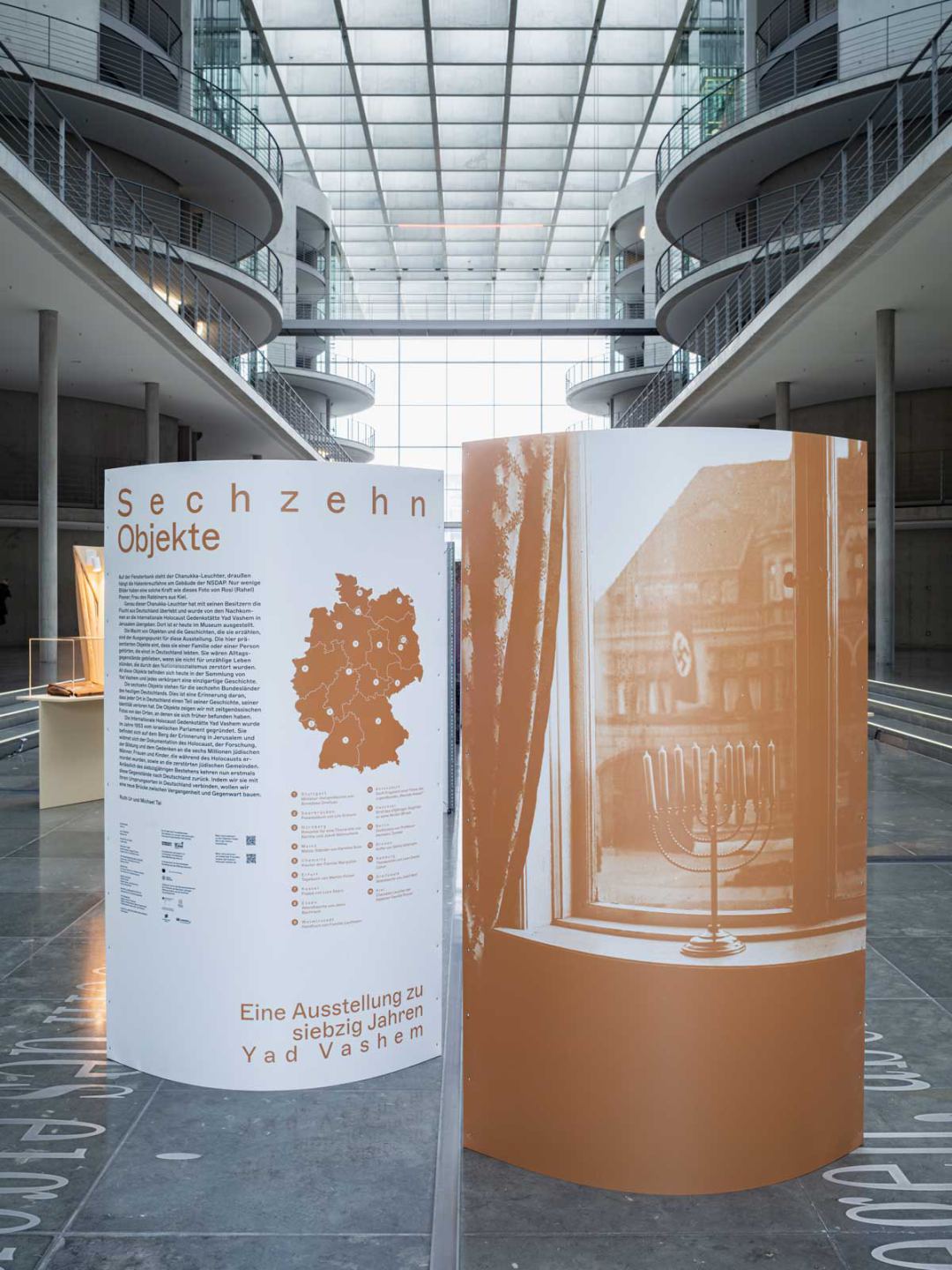 Sechzehn Objekte, exhibition graphics and campaign design for Freundeskreis Yad Vashem e.V., at Paul-Löbe-Haus, Deutscher Bundestag and UNESCO world heritage site Zeche Zollverein in Essen, 2023