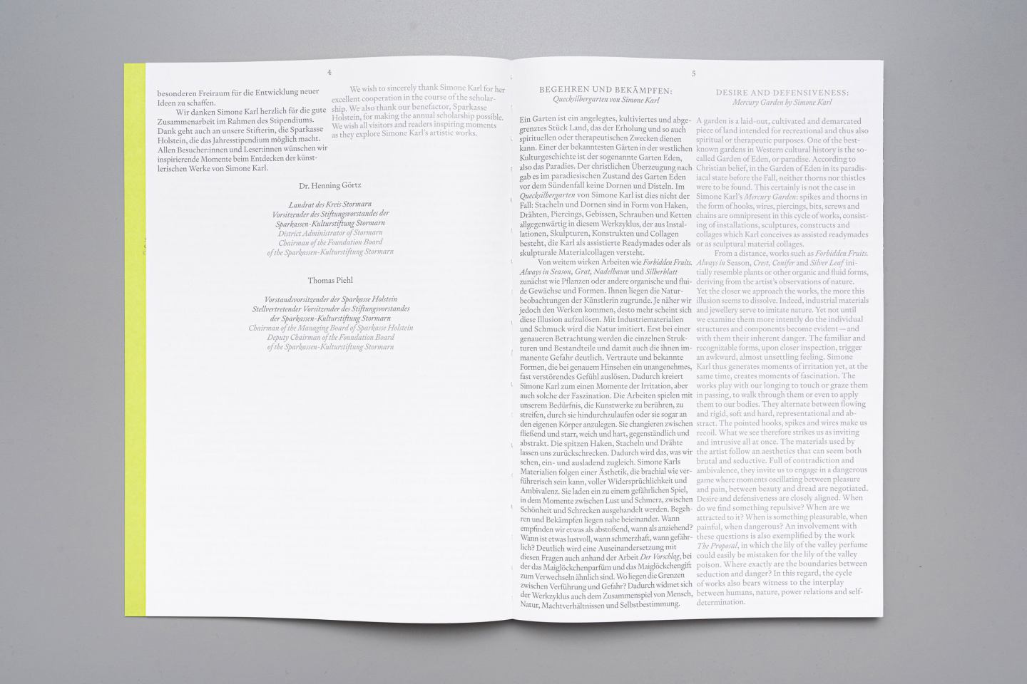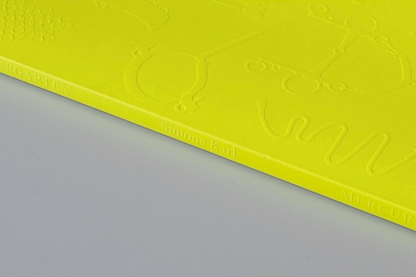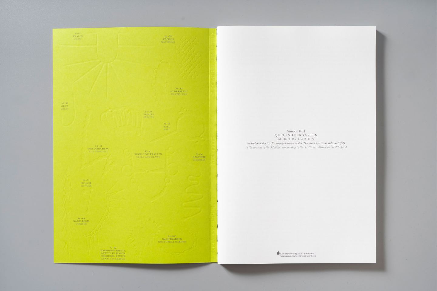 Transferring this attraction into a book object, we embossed individual elements of her work onto the cover. The familiar and recognizable forms, upon closer inspection, trigger an awkward, almost unsettling feeling. When you open the catalog, the negative of the shapes serves as part of the table of contents and becomes a narrative and functional element at the same time. Another key component of our design is the concentrated color of the poisenous lily of the valley. Green yet yellowish, it refers to the ambiguous character of Simone Karl’s work and creates a link to the eponymous title Mercury Garden.