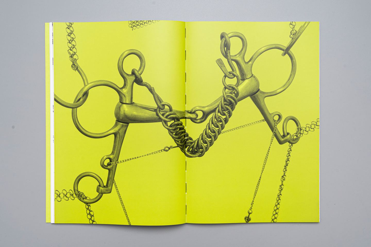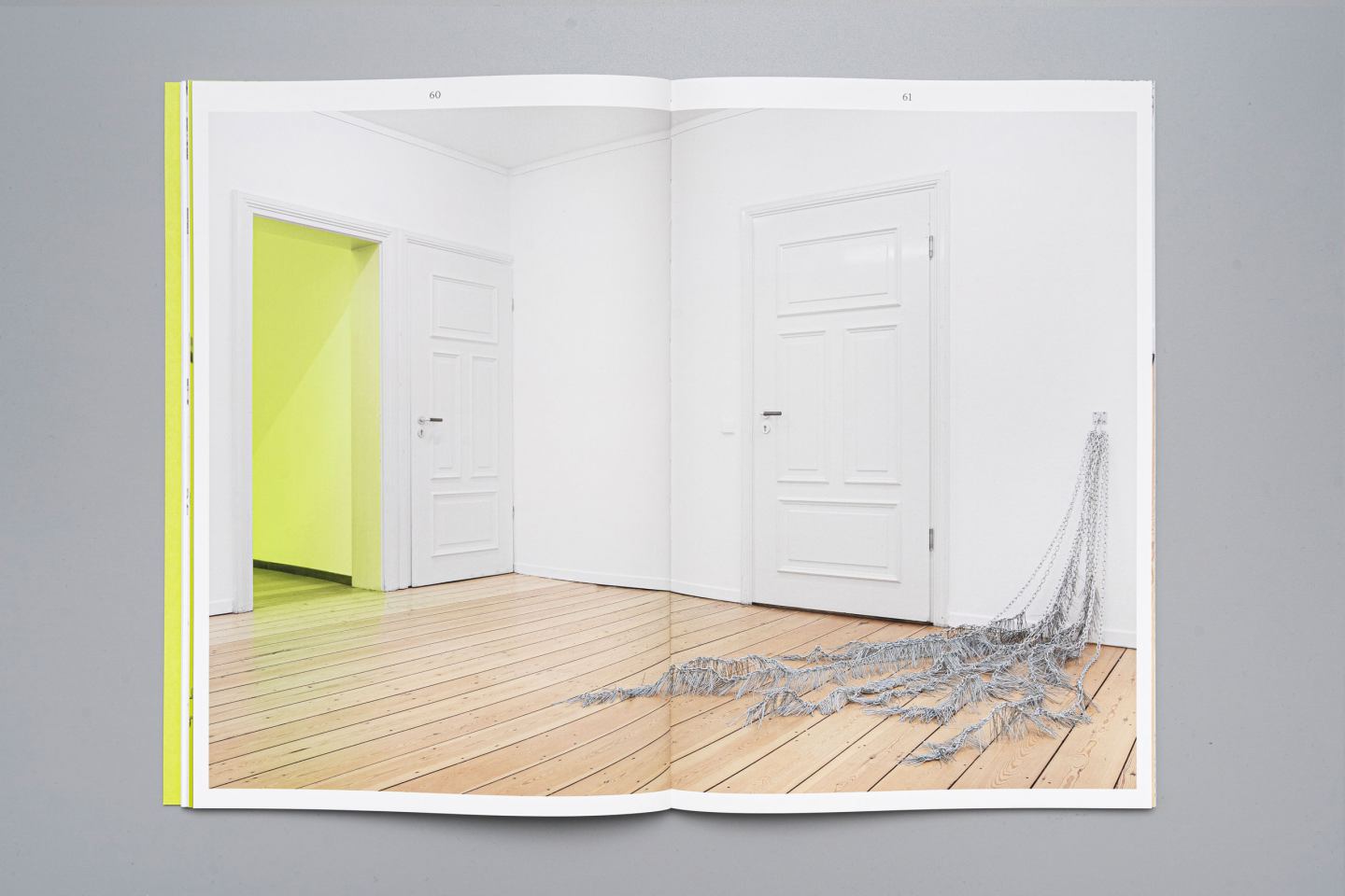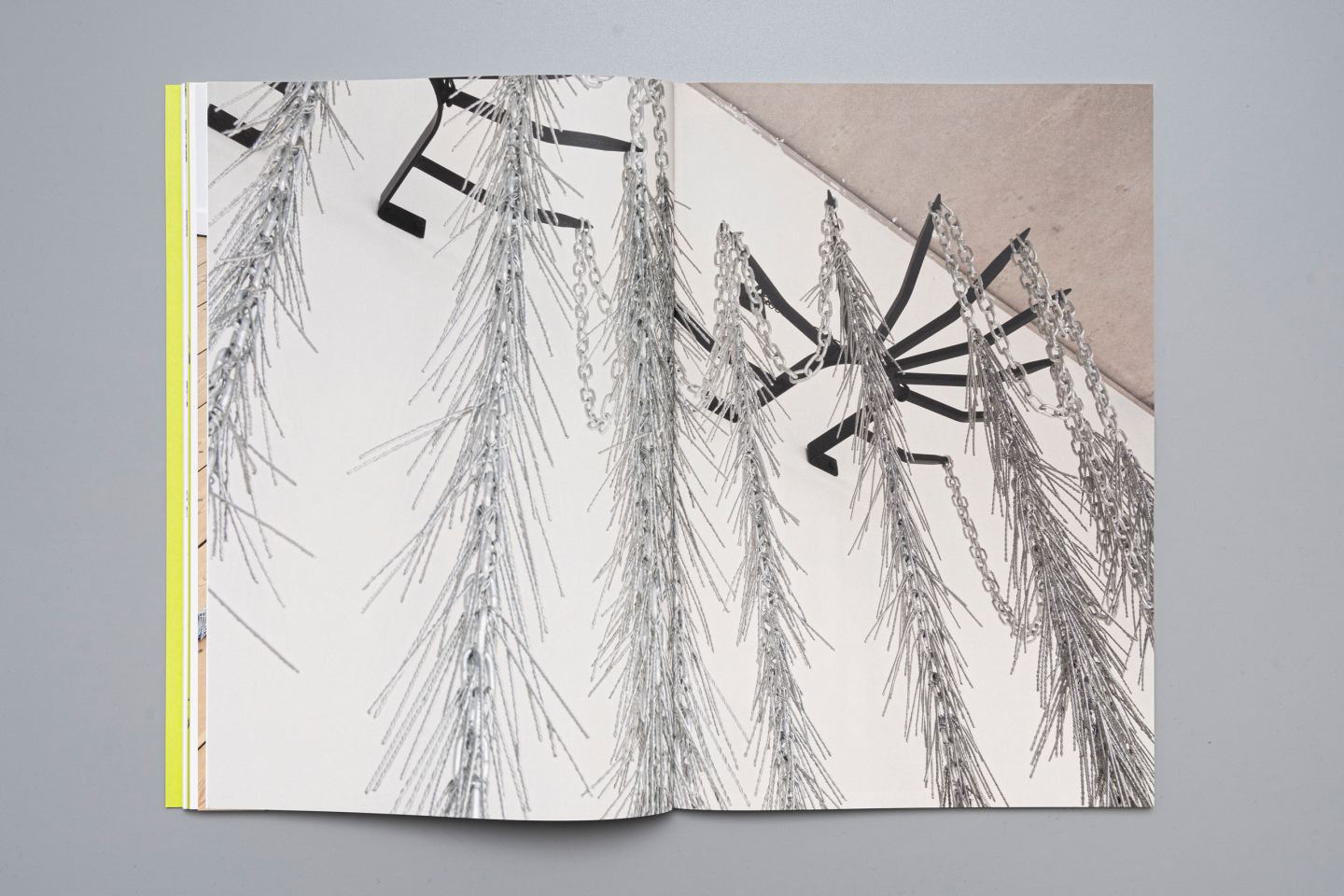 Transferring this attraction into a book object, we embossed individual elements of her work onto the cover. The familiar and recognizable forms, upon closer inspection, trigger an awkward, almost unsettling feeling. When you open the catalog, the negative of the shapes serves as part of the table of contents and becomes a narrative and functional element at the same time. Another key component of our design is the concentrated color of the poisenous lily of the valley. Green yet yellowish, it refers to the ambiguous character of Simone Karl’s work and creates a link to the eponymous title Mercury Garden.