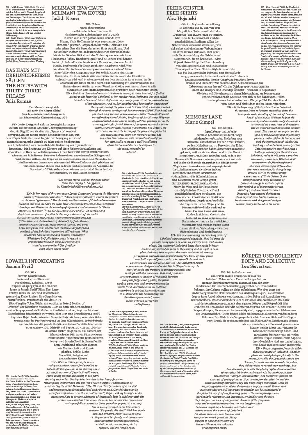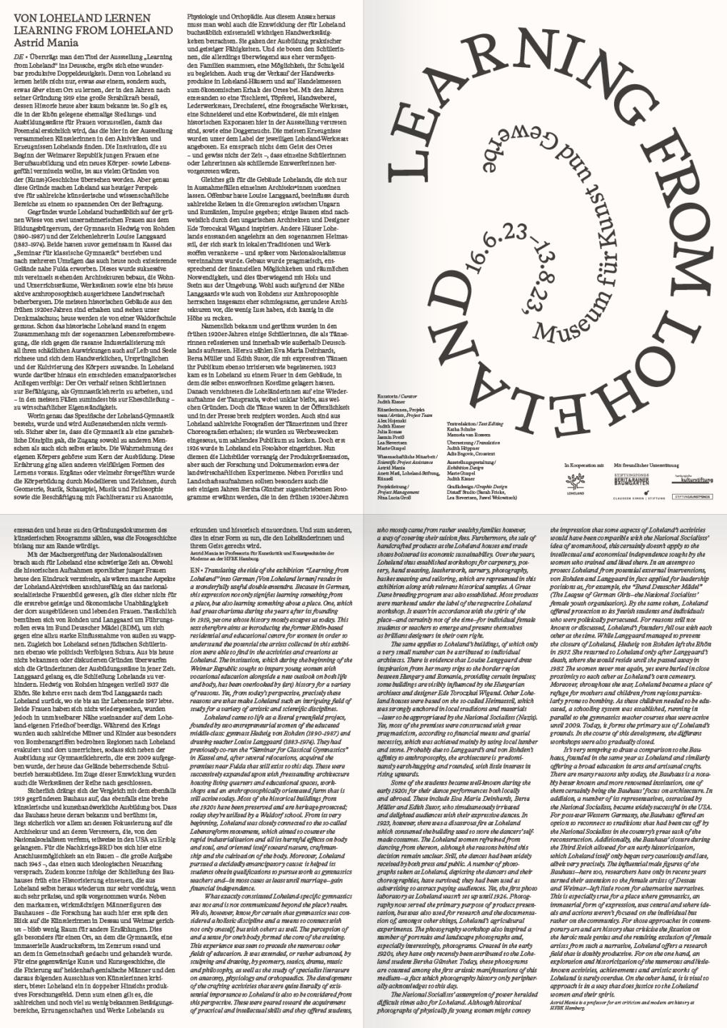 Loheland is a unique settlement and educational project for young women, founded in 1919 close to Fulda, Germany. A lively settlement to educate and house female students, fueled by a profound creative drive and talent for improvisation. The exhibition “Learning from Loheland” presents this chapter of German design and arts history from the viewpoint of six contemporary artists. They intertwine the perspectives of Loheland’s students on the female* body, their imagery, affiliations, and value-related questions with current, feminist, and personal contexts. As the exhibition was planned as a holistic concept, the architecture provides walkable paths throughout the rooms. The typography alludes to these designs, as well as to the vibrant and amorphous aesthetics of Loheland itself.
