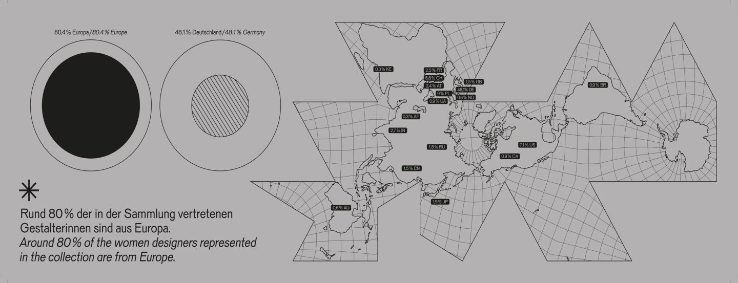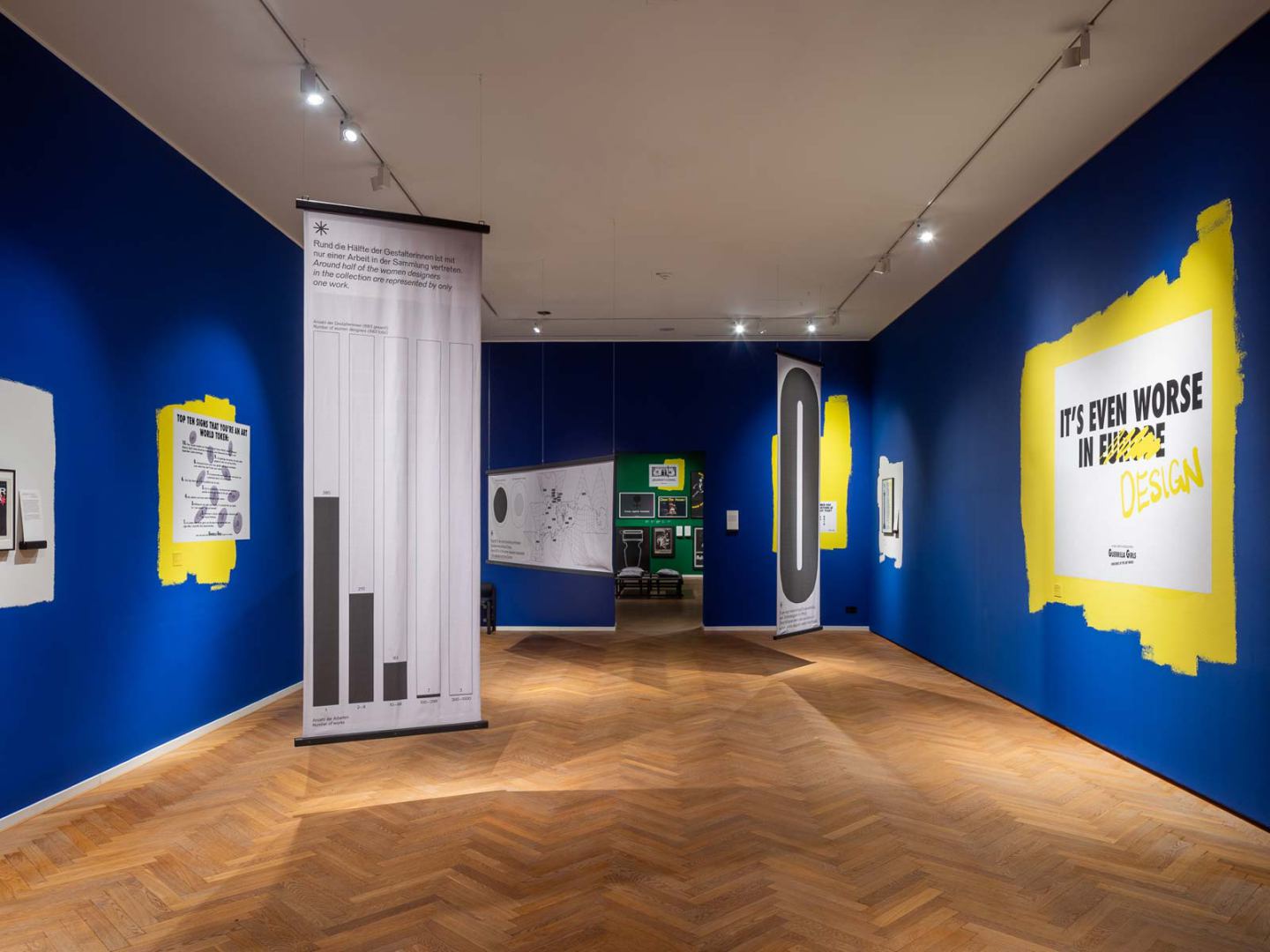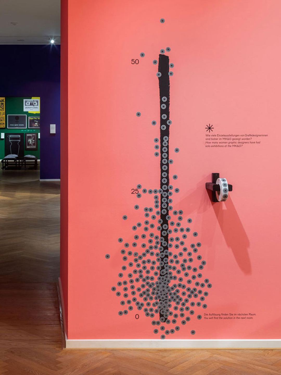 A topic that we have already contemplated extensively in personal projects is the question of female representation and feminist positions within the graphic design field. The exhibition “The F*Word” tackles this issue and starts with an introspective approach: the museum scrutinizes its own graphic collection in terms of female positions and how to address the issue of underrepresentation. These findings are explored within an extensive exhibition. In close collaboration with the curator and the exhibition designers, we have developed and designed mediation stations within the exhibition space that enable different approaches to the topics, provide explanations, introduce, engage, offer respites, and encourage questions, as access to the information should be as versatile and multi-layered as the graphic design on display.