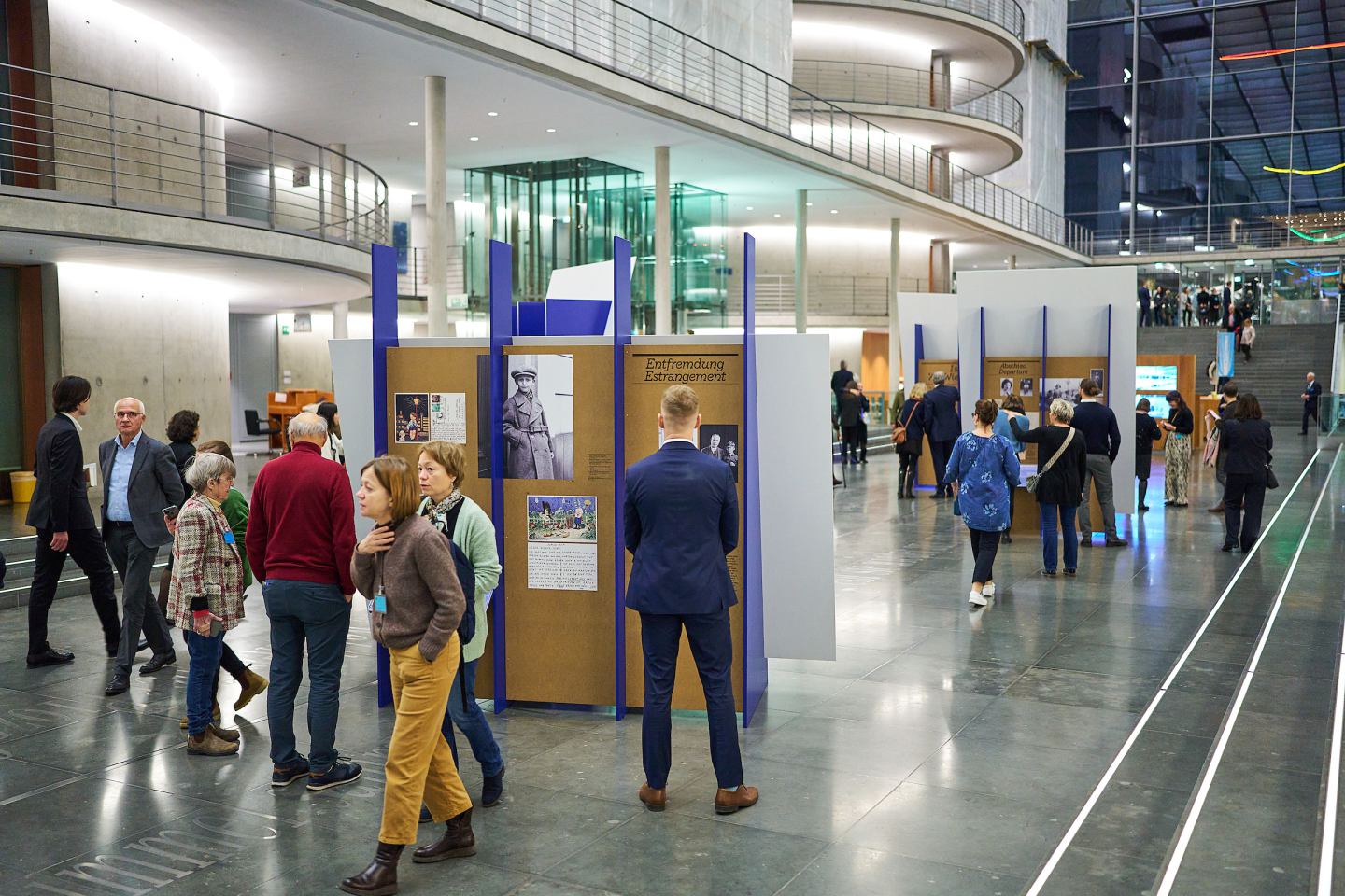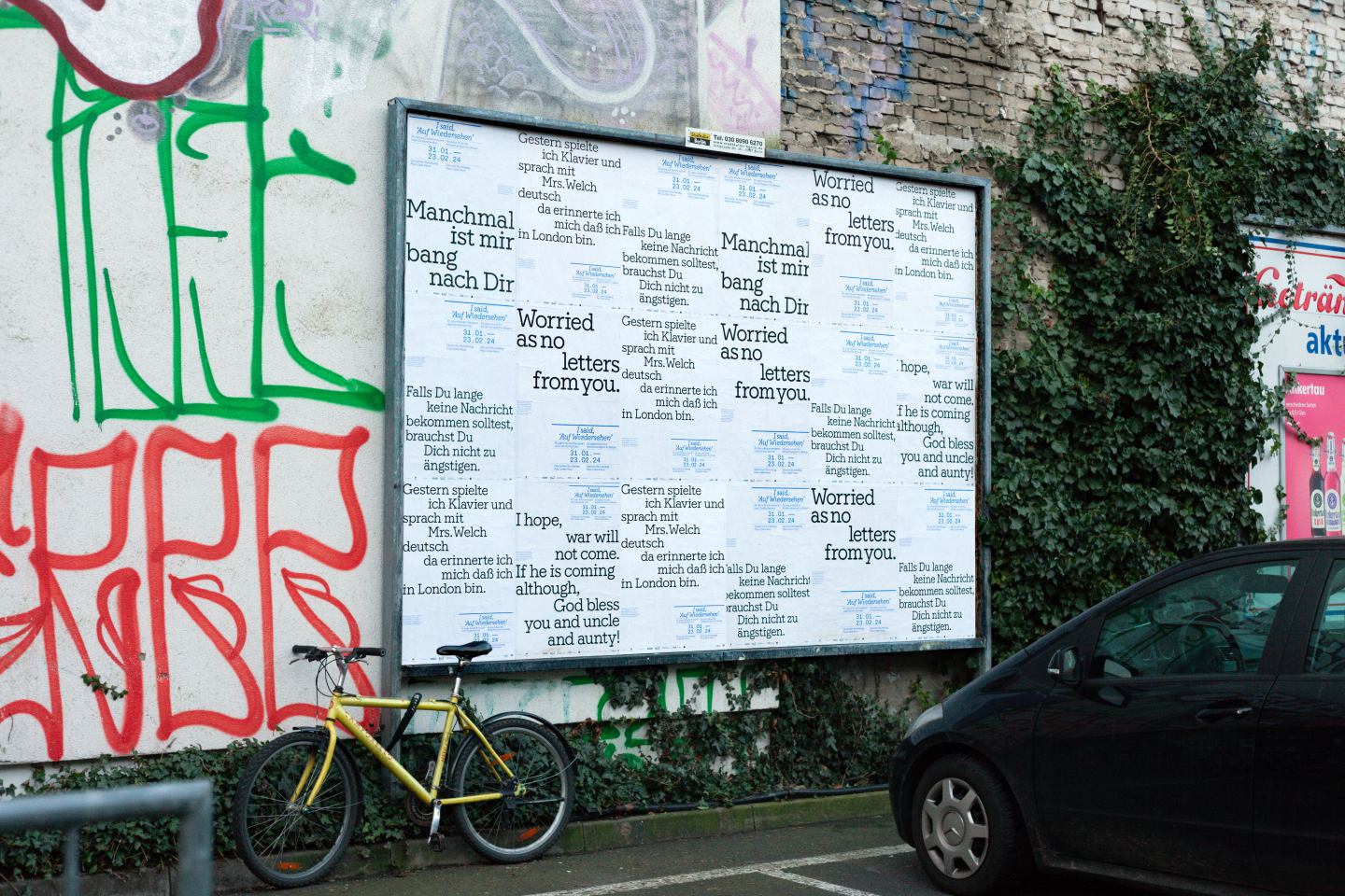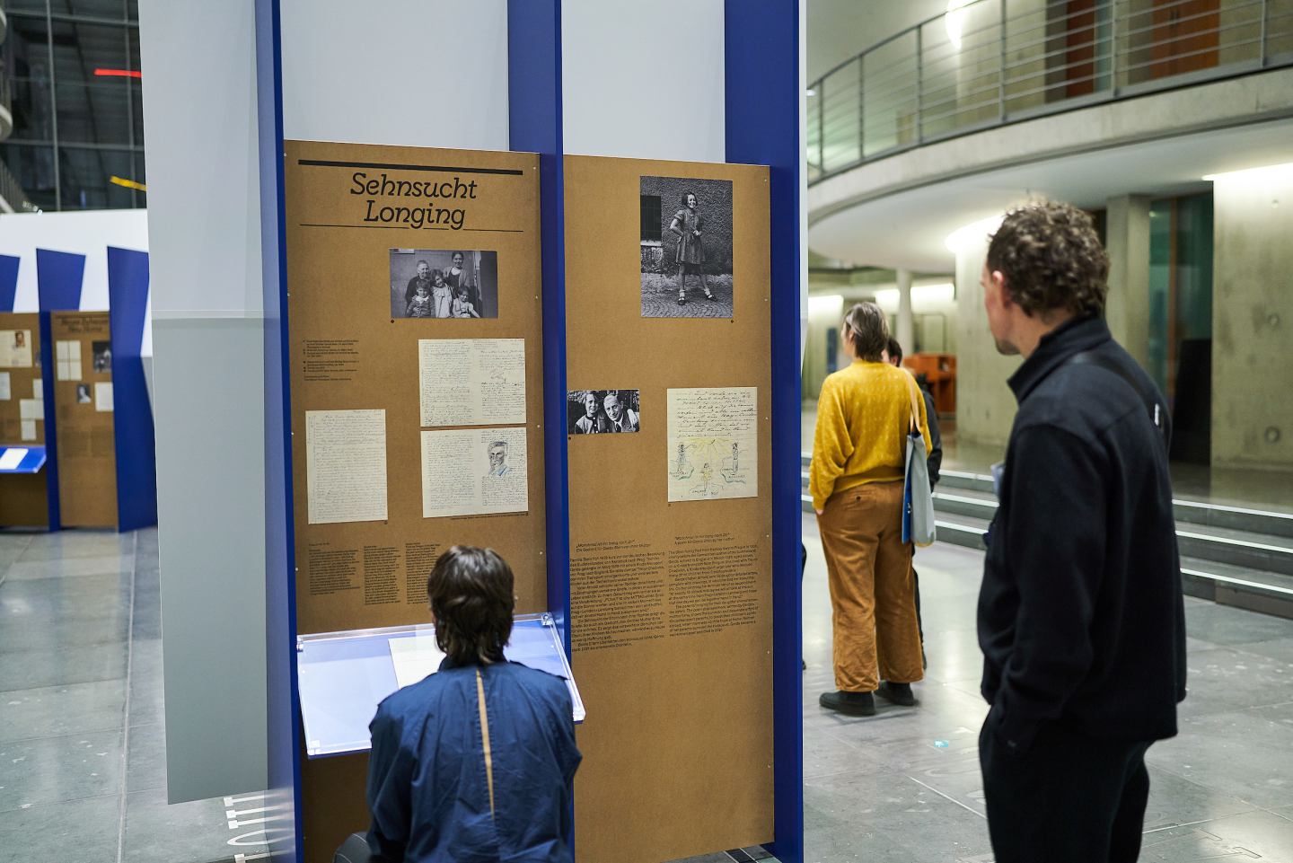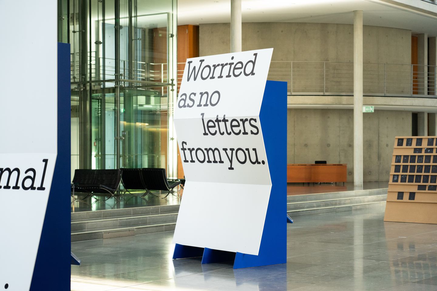 Six displays showcase representative quotes on their front sides, while the backs tell the stories through numerous documents and photographs. The chosen blue, inspired by the ink of handwritten letters, unites all elements into a common narrative. Furthermore, we connect the media and the exhibition through a sender’s stamp. This stamp also links the individual quotes, which we carried out into the city as part of a poster campaign, their open wording building a bridge between the fates of the past and the experiences of the present.