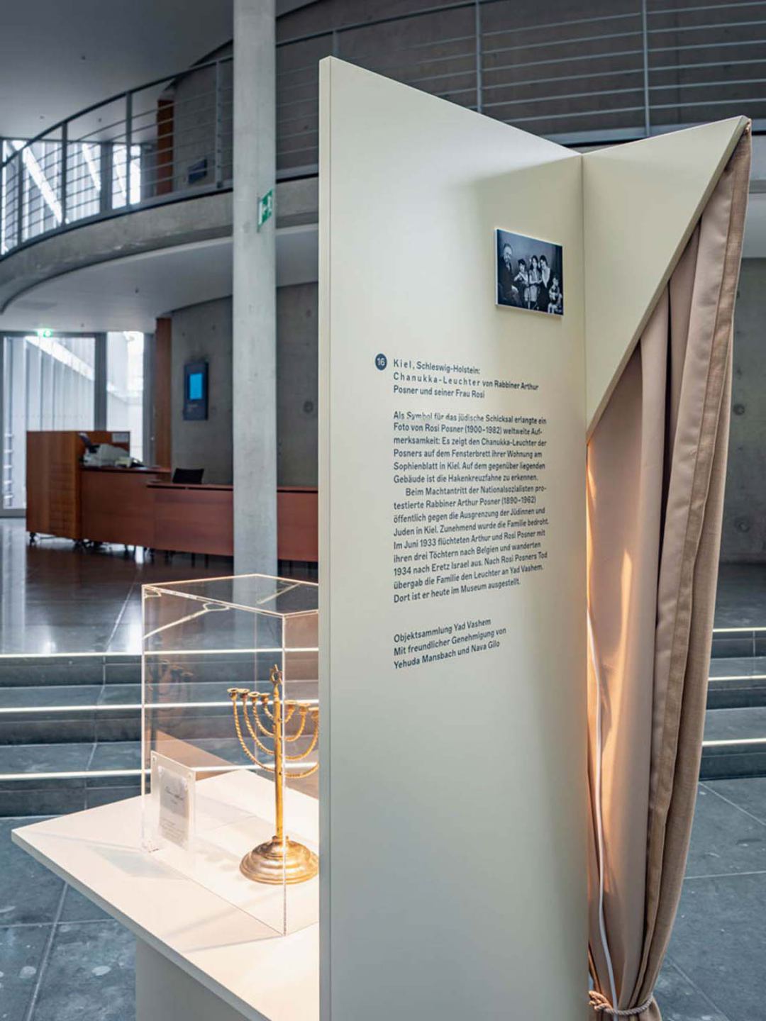 “Sechzehn Objekte” is an exhibition that delves into Jewish life in Germany and beyond during the Holocaust. Sixteen distinct objects, referring to the federal states of Germany and originally situated in the Holocaust Memorial Center Yad Vashem in Jerusalem, are returning to Germany for the first time to tell their stories and those of the individuals they belonged to. Curator Ruth Ur has placed a strong emphasis on elevating these objects to the forefront while complementing their significance with a sensitive approach to providing additional context. The entire exhibition concept draws inspiration from an iconic photograph: a Chanukah chandelier, captured by Rahel Posner in 1931 in Kiel. This inspirational imagery guided the design of the exhibition’s architecture, which was designed by Kooperative für Darstellungspolitik. The compelling narrative of disintegration and reunification is an idea that has found its way into our graphic concept for the exhibition and all related media.